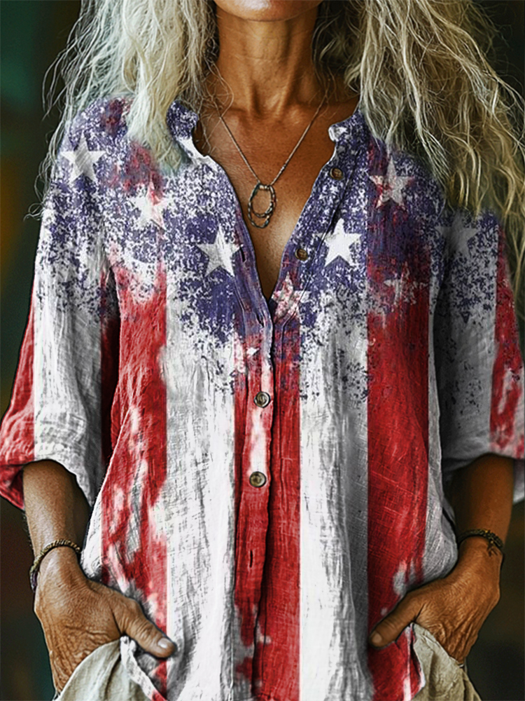 Women's Star National Flag Color Matching Pattern Art Print Casual Cotton Linen Shirt