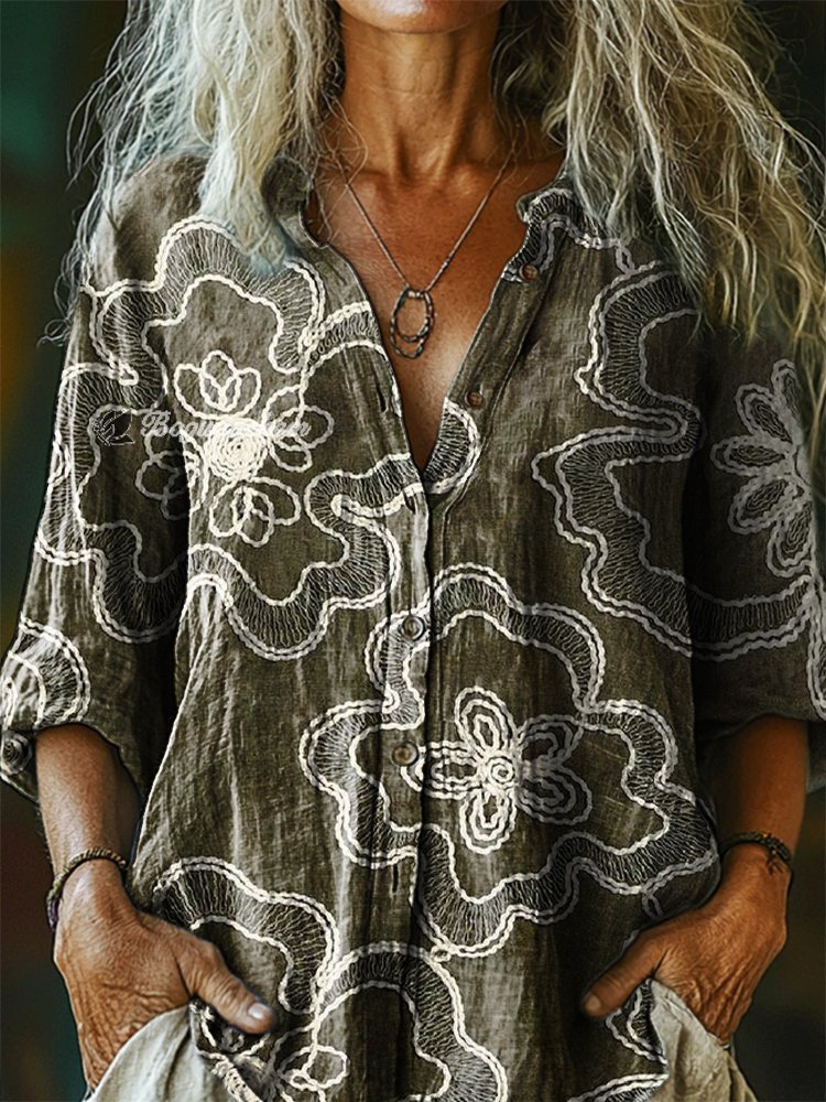 Women's Vintage Bohemian Floral Art Print Casual Cotton Linen Shirt