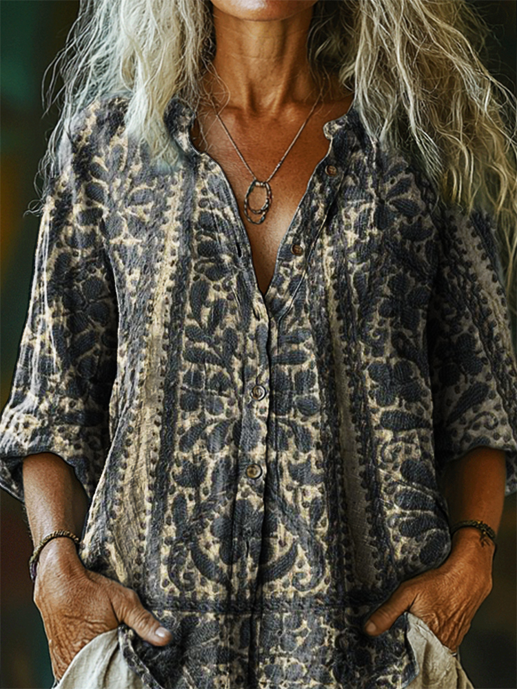 Women's Vintage Bohemian Floral Art Print Casual Cotton Linen Shirt