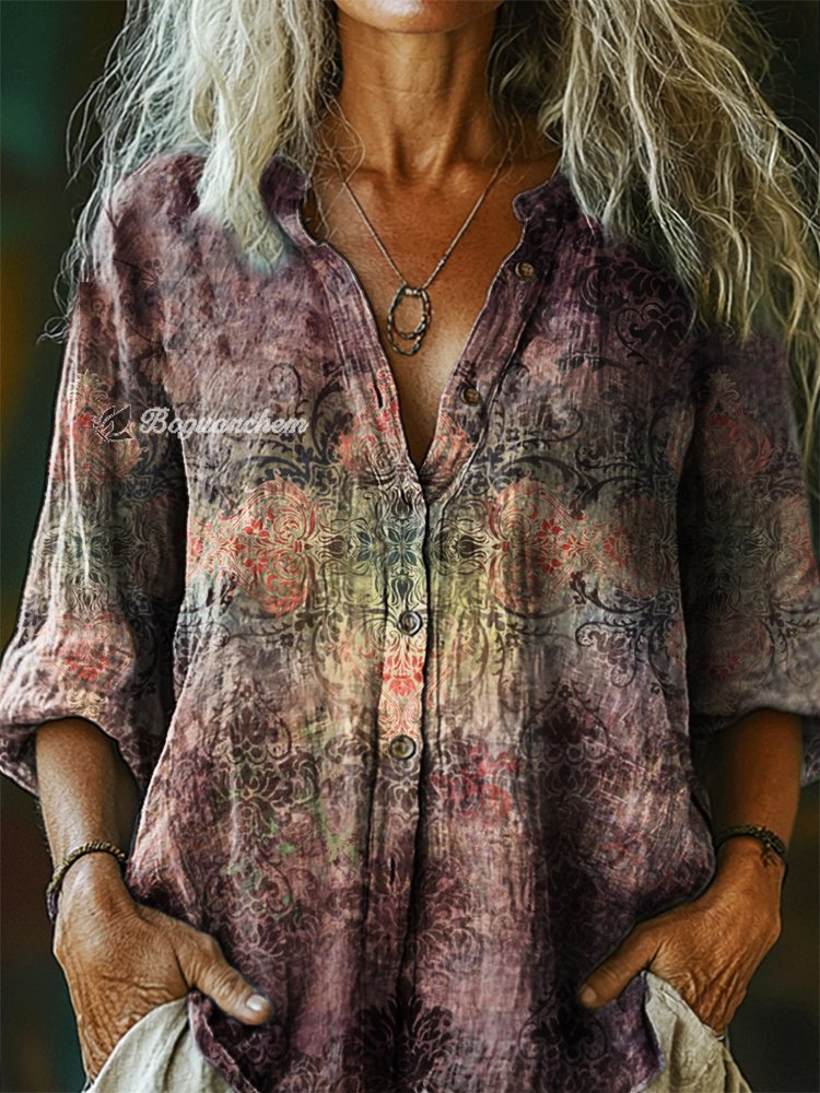 Women's Vintage Bohemian Floral Art Print Casual Cotton Linen Shirt