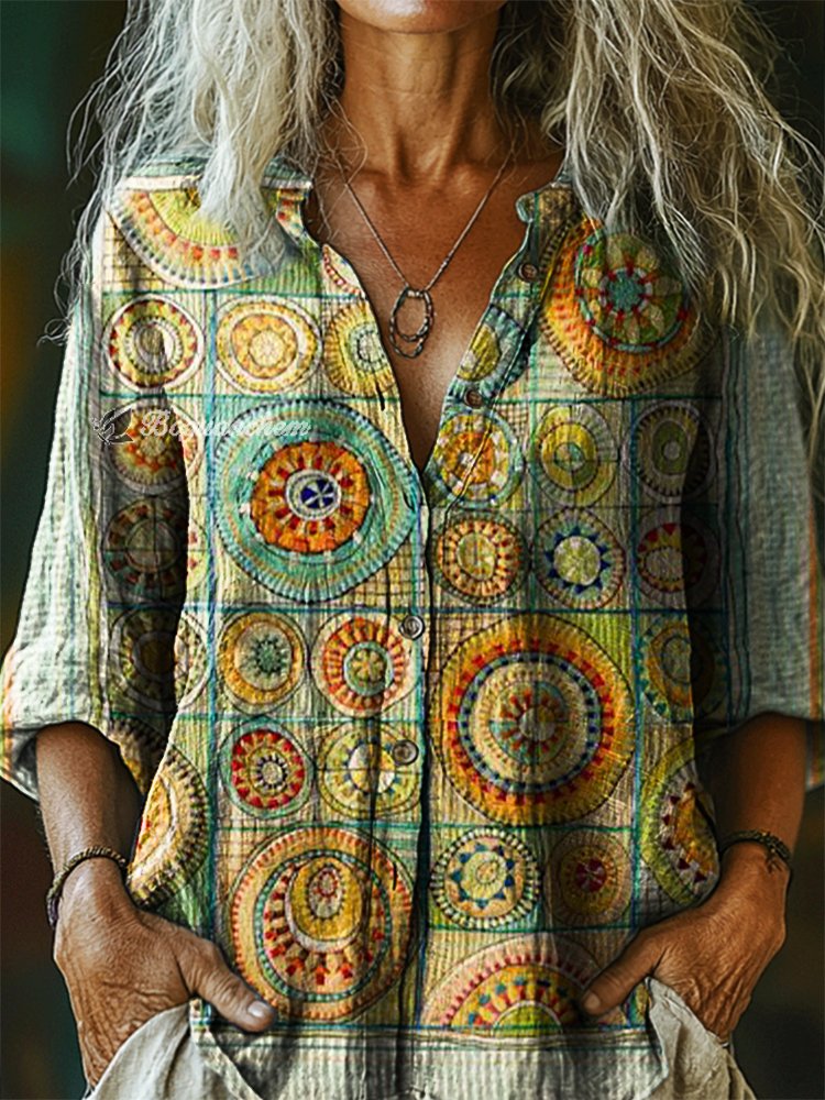 Women's Vintage Bohemian Patchwork Art Print Casual Cotton Linen Shirt