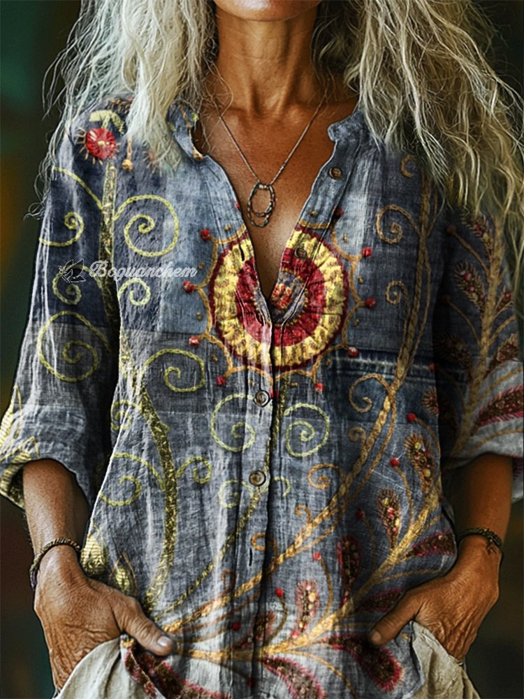 Women's Vintage Bohemian Pattern Art Print Casual Cotton Linen Shirt