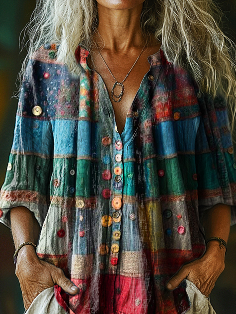 Women's Vintage Colorful Patchwork Pattern Art Print Casual Cotton Linen Shirt