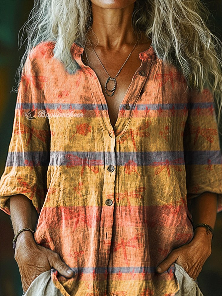 Women's Vintage Dragonfly Art Print Casual Cotton Linen Shirt