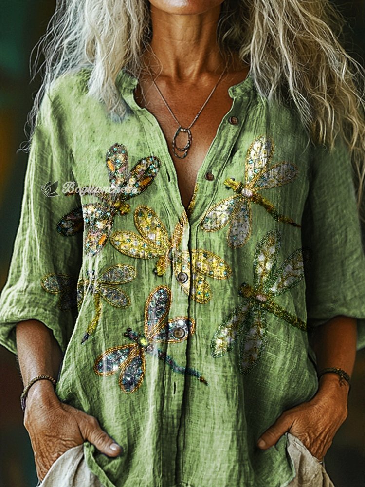 Women's Vintage Dragonfly Art Print Casual Cotton Linen Shirt