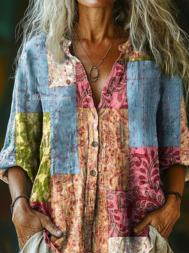 Women's Vintage Ethnic Collage Art Pattern Print Casual Cotton Linen Shirt