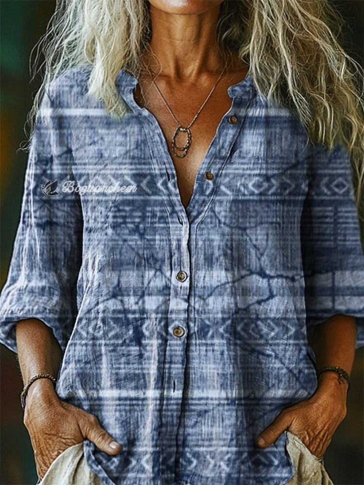 Women's Vintage Ethnic Floral Art Print Casual Cotton And Linen Shirt