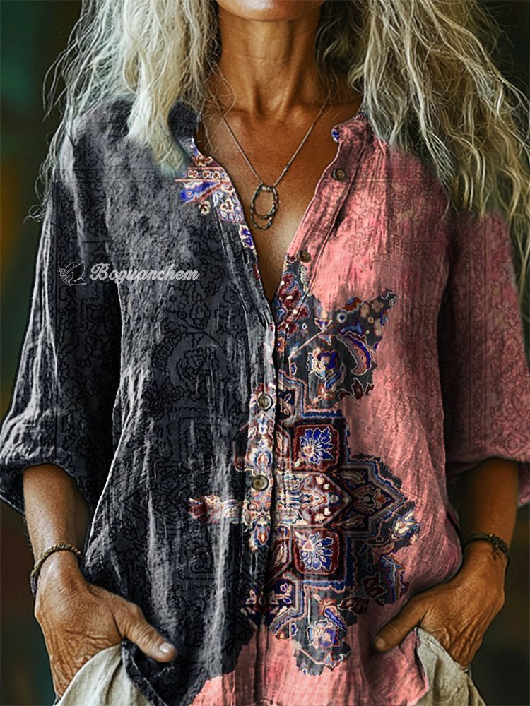 Women's Vintage Ethnic Floral Art Print Casual Cotton Linen Shirt