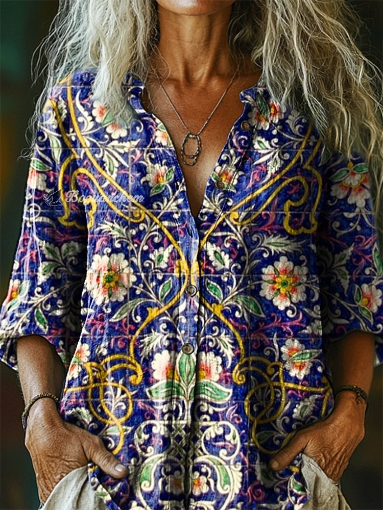 Women's Vintage Ethnic Floral Art Print Casual Cotton Linen Shirt