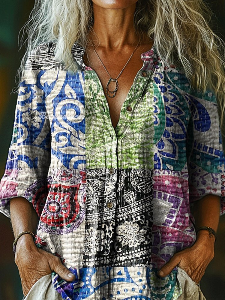 Women's Vintage Ethnic Floral Art Print Casual Cotton Linen Shirt