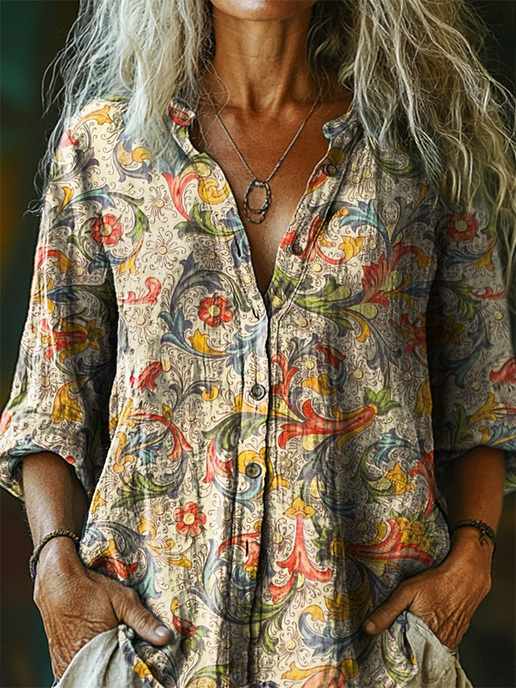 Women's Vintage Ethnic Floral Art Print Casual Cotton Linen Shirt