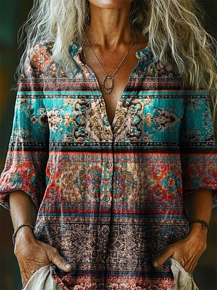 Women's Vintage Ethnic Floral Art Print Casual Cotton Linen Shirt