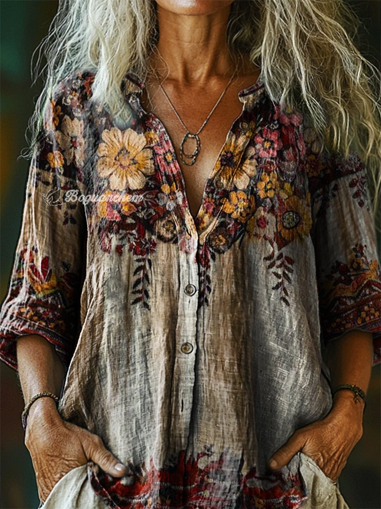Women's Vintage Ethnic Floral Art Print Casual Cotton Linen Shirt