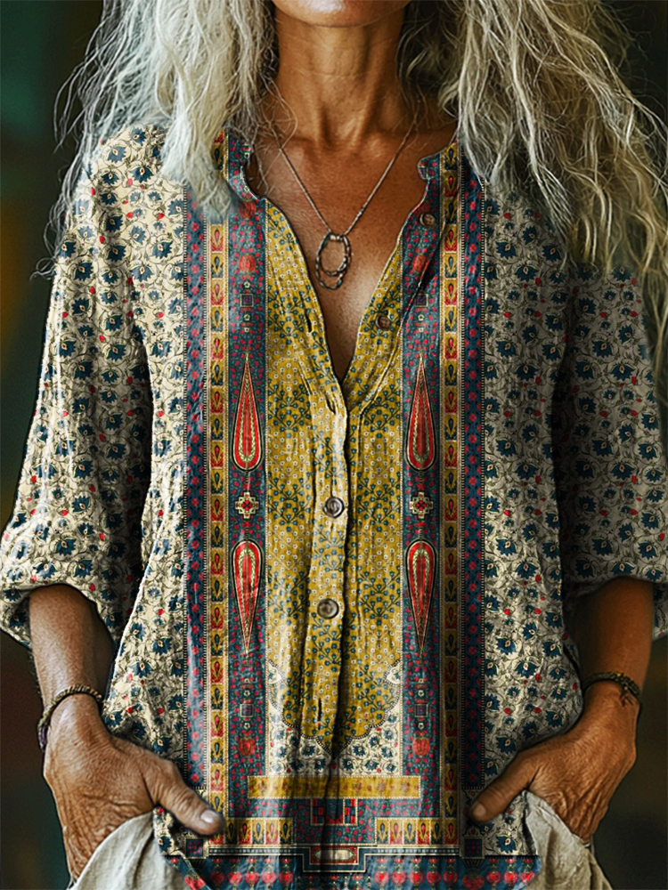 Women's Vintage Ethnic Floral Art Print Casual Cotton Linen Shirt