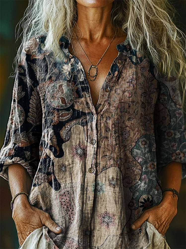 Women's Vintage Ethnic Floral Art Print Casual Cotton Linen Shirt