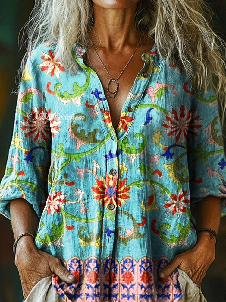 Women's Vintage Ethnic Floral Art Print Casual Cotton Linen Shirt