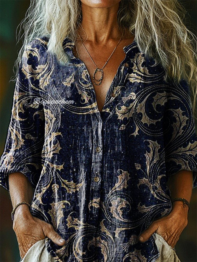 Women's Vintage Ethnic Floral Art Print Casual Cotton Linen Shirt