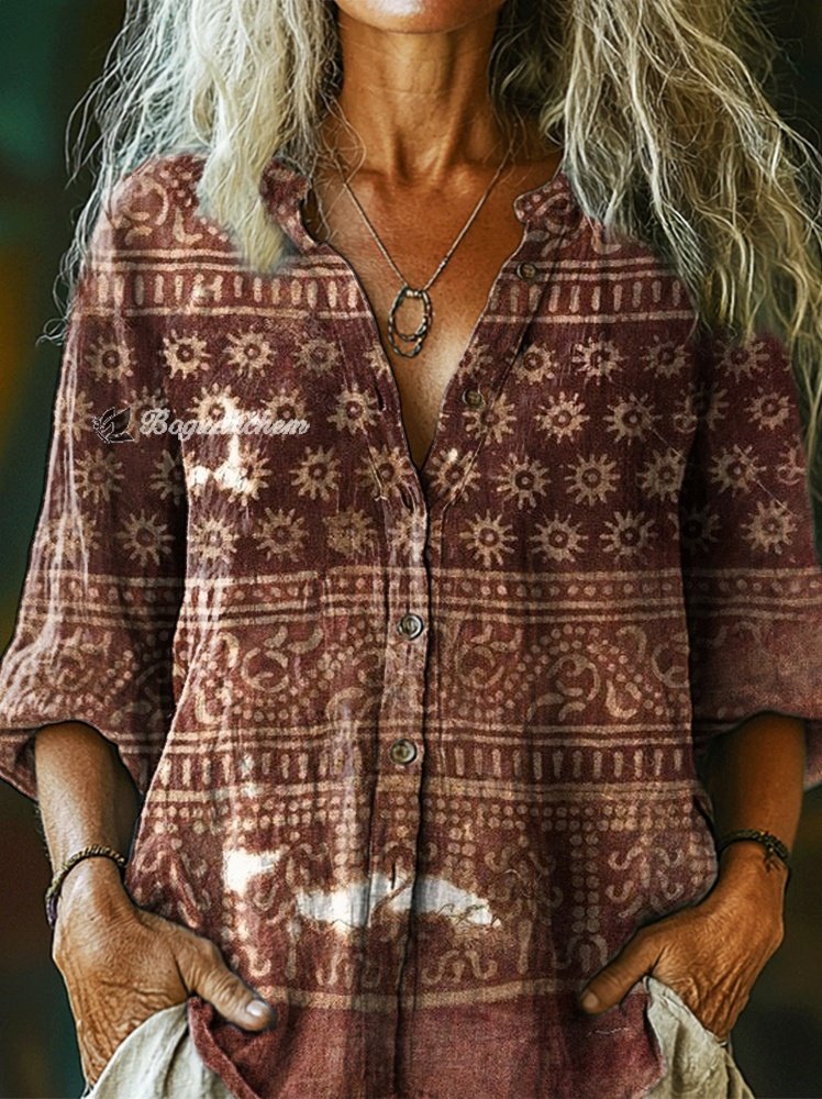 Women's Vintage Ethnic Floral Collage Art Print Casual Cotton Linen Shirt