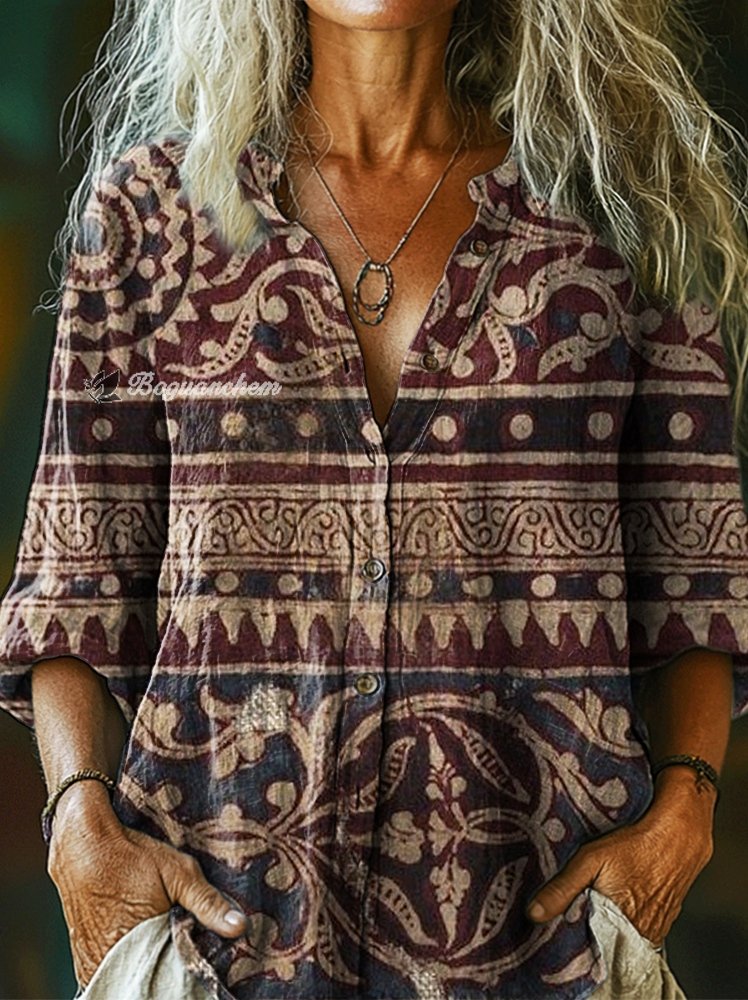 Women's Vintage Ethnic Floral Collage Art Print Casual Cotton Linen Shirt
