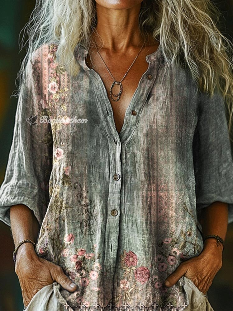 Women's Vintage Ethnic Floral Print Casual Cotton Linen Shirt