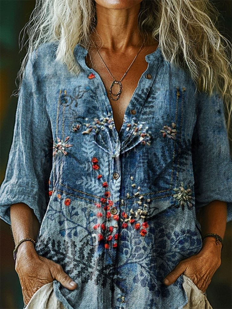 Women's Vintage Ethnic Floral Tattoo Collage Pattern Art Print Casual Cotton Linen Shirt