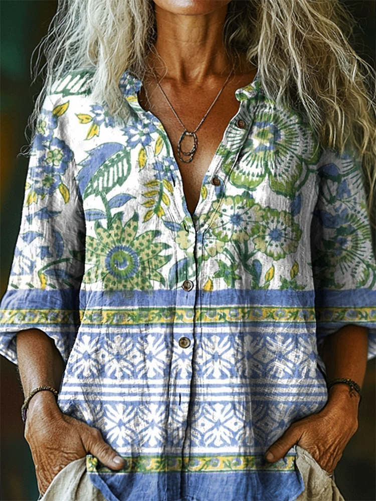 Women's Vintage Ethnic Floral Tattoo Pattern Art Print Casual Cotton Linen Shirt