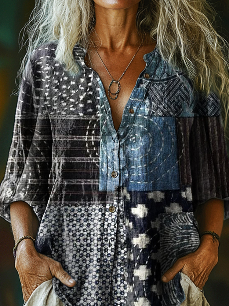 Women's Vintage Ethnic Patchwork Pattern Art Print Casual Cotton Linen Shirt