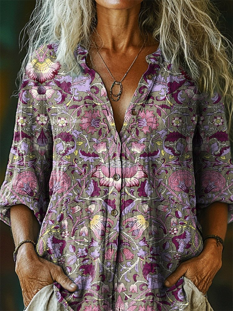Women's Vintage Ethnic Style Floral Tattoo Pattern Art Print Casual Cotton Linen Shirt