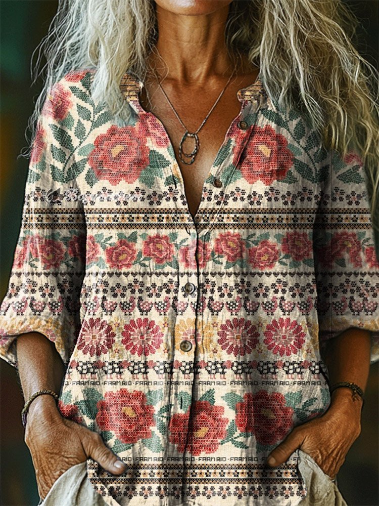 Women's Vintage Ethnic Style Floral Tattoo Pattern Art Print Casual Cotton Linen Shirt