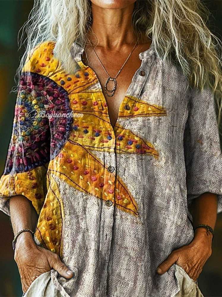 Women's Vintage Ethnic Sunflower Art Print Casual Cotton and Linen Shirt