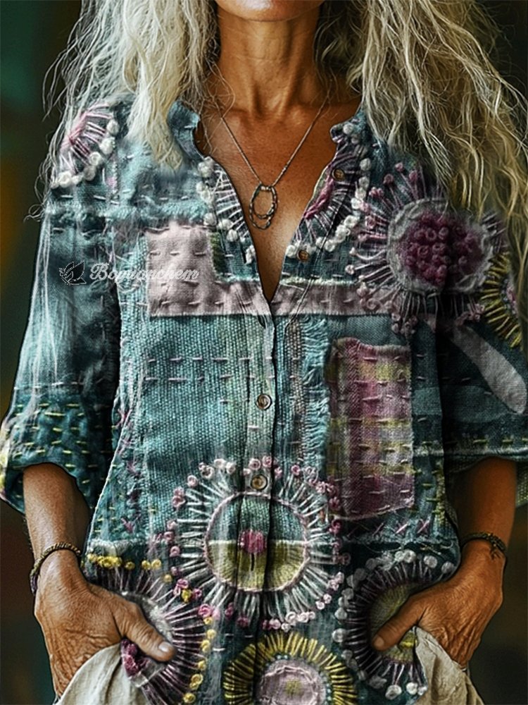 Women's Vintage Ethnic Tattoo Pattern Art Print Linen Cotton Casual Shirt