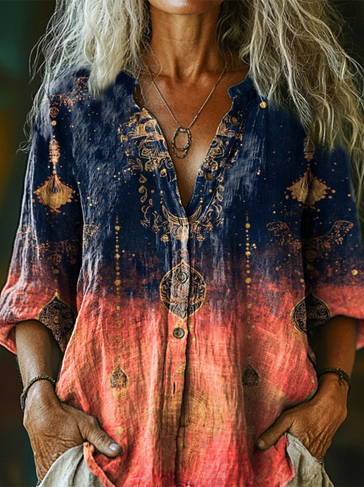 Women's Vintage Ethnic Tribal Art Pattern Print Casual Cotton Linen Shirt