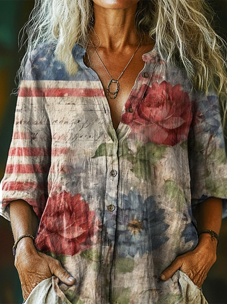 Women's Vintage Flag Floral Art Print Casual Cotton Linen Shirt