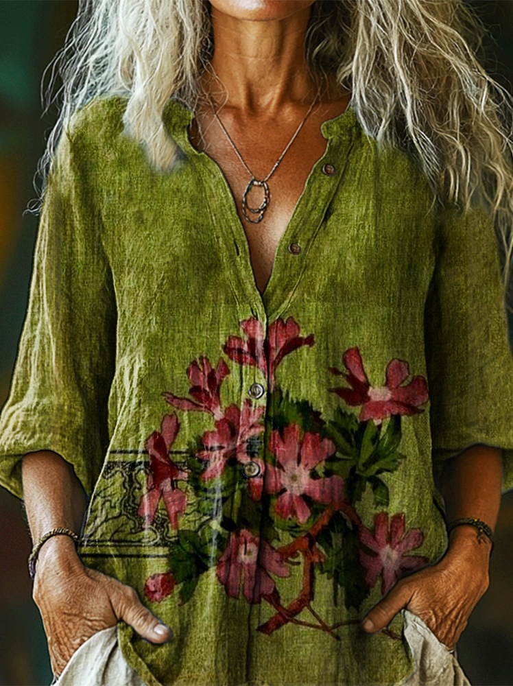 Women's Vintage Floral Art Pattern Print Casual Cotton Linen Shirt