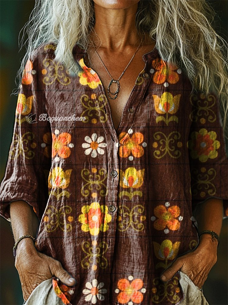 Women's Vintage Floral Art Print Casual Cotton Linen Shirt