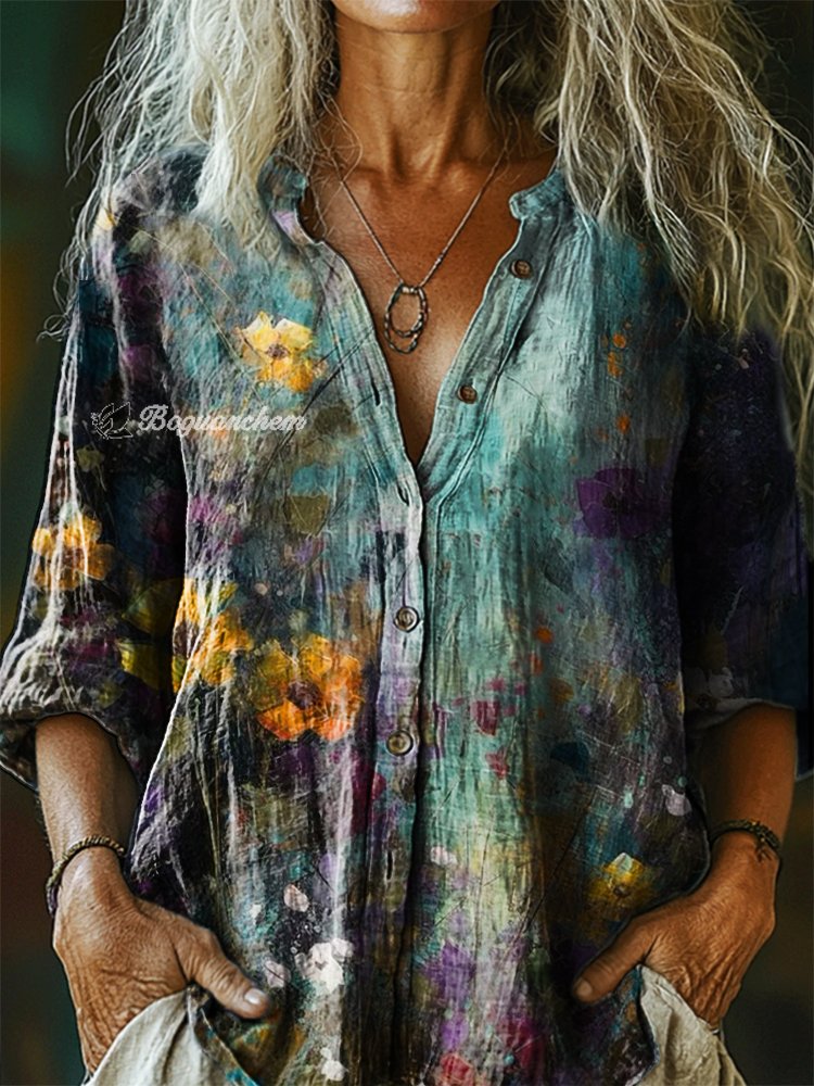 Women's Vintage Floral Art Print Casual Cotton Linen Shirt