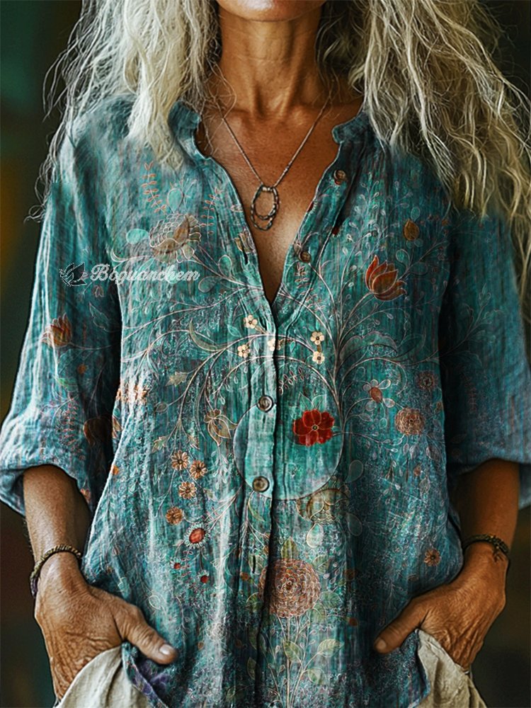 Women's Vintage Floral Art Print Casual Cotton Linen Shirt