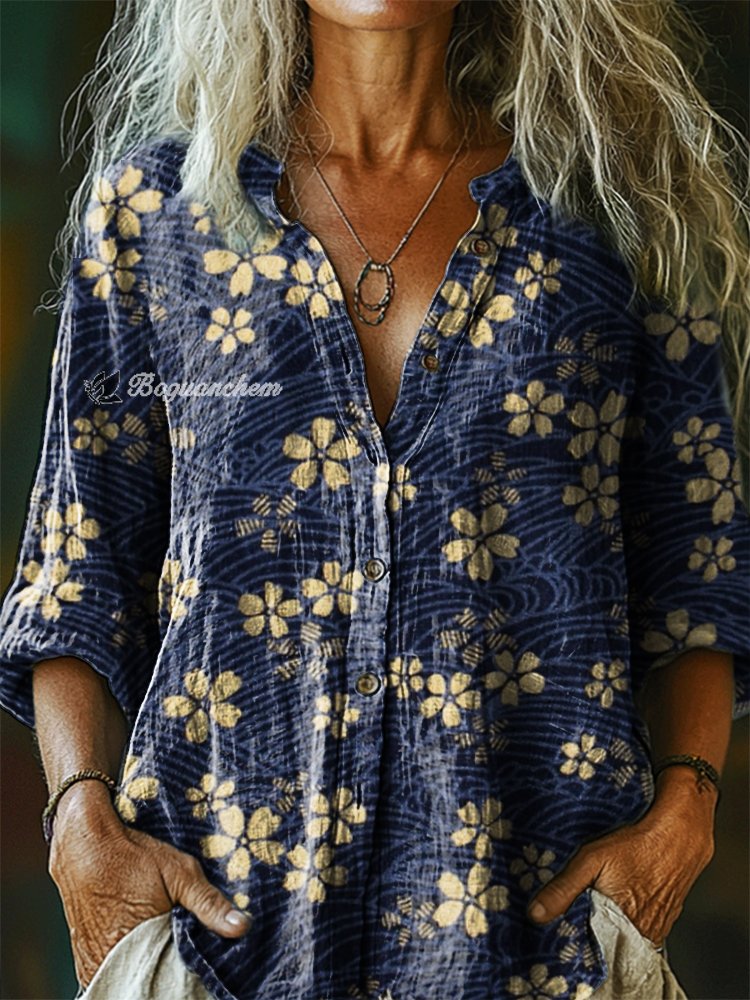 Women's Vintage Floral Art Print Casual Cotton Linen Shirt