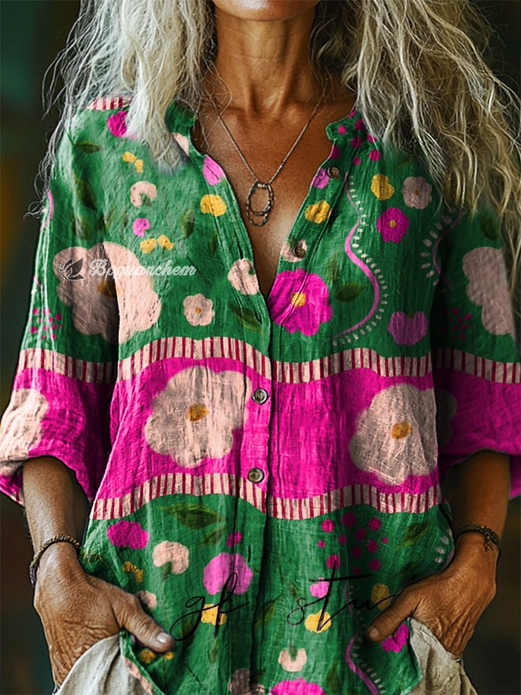 Women's Vintage Floral Art Print Casual Cotton Linen Shirt