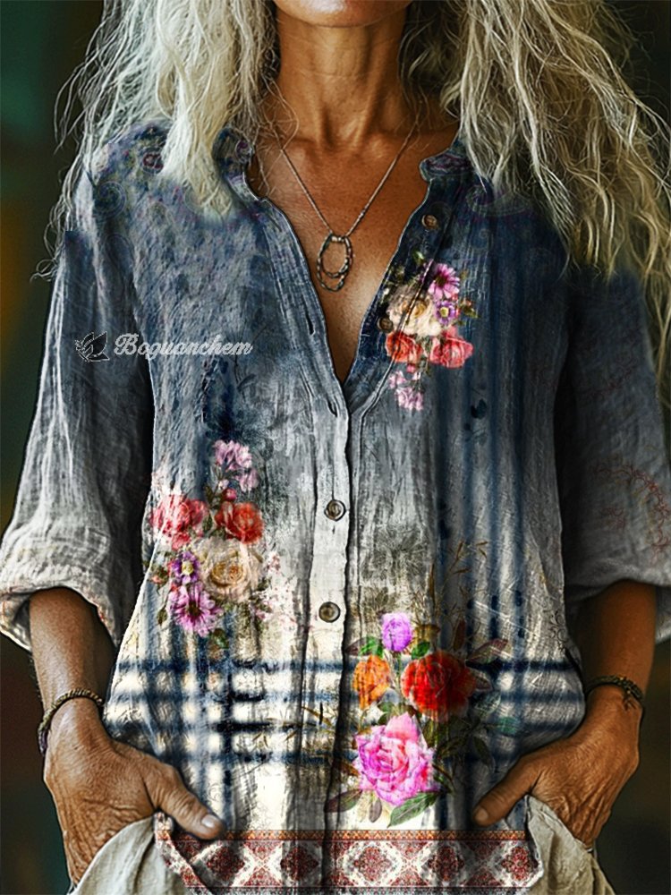 Women's Vintage Floral Art Print Casual Cotton Linen Shirt