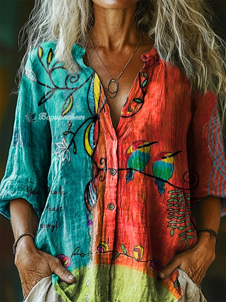 Women's Vintage Floral Bird Art Print Casual Cotton Linen Shirt