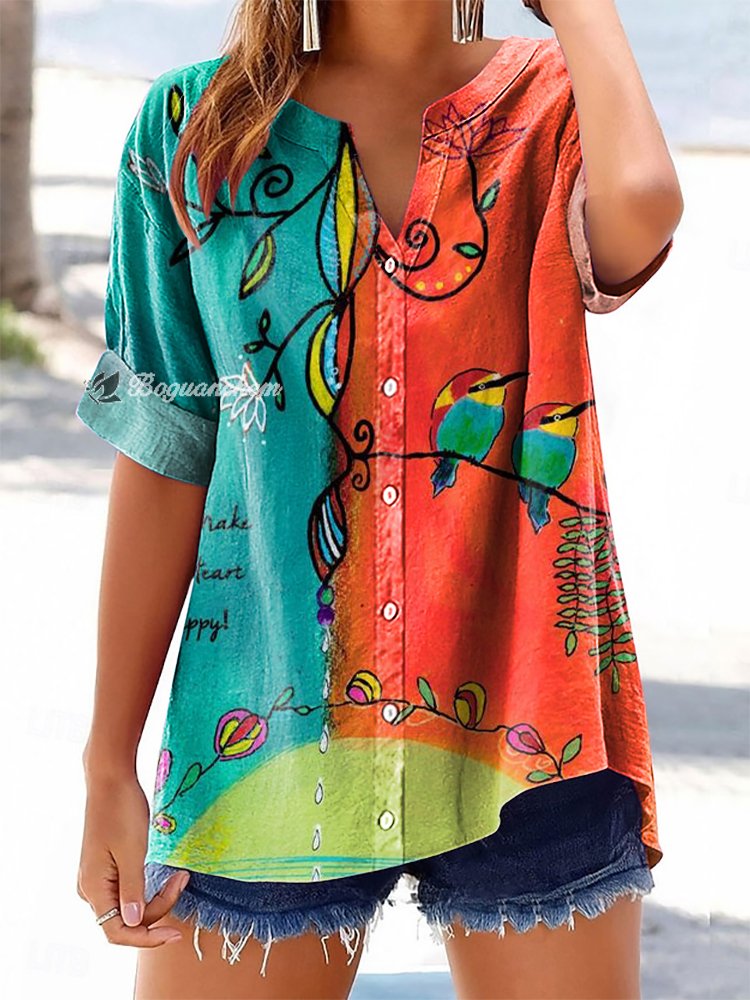 Women's Vintage Floral Bird Art Printed Casual Short Sleeve Cotton and Linen Shirt