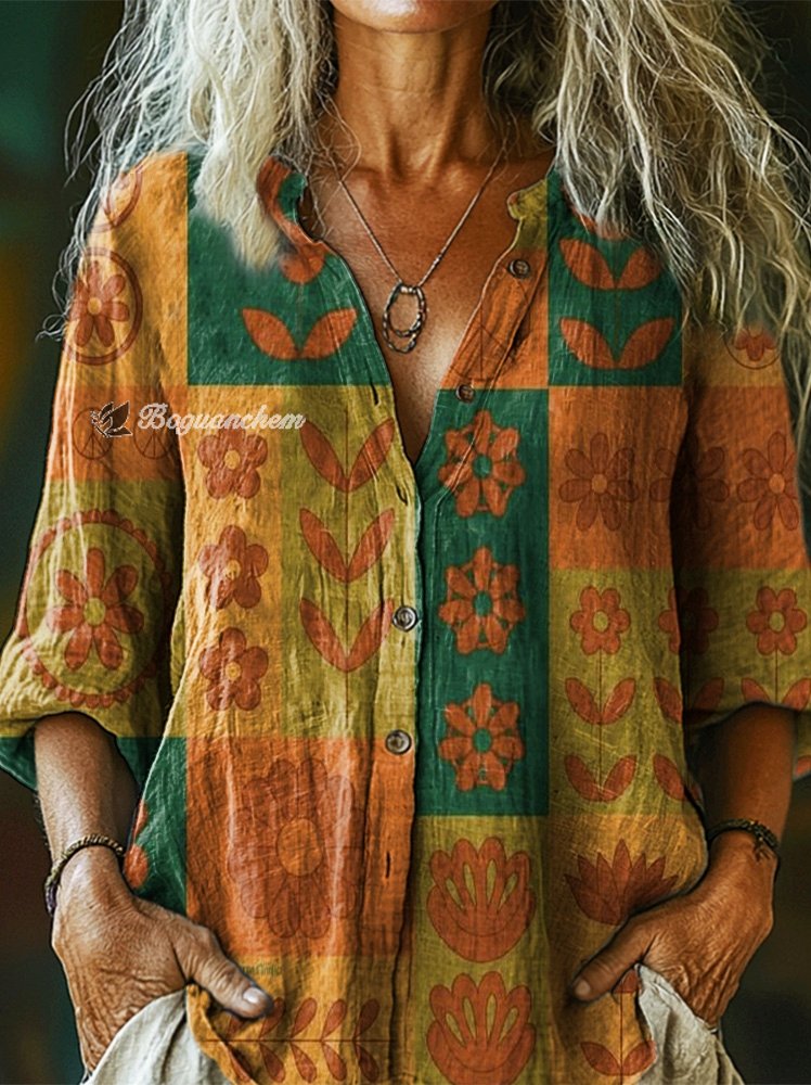 Women's Vintage Floral Collage Art Pattern Print Casual Cotton Linen Shirt