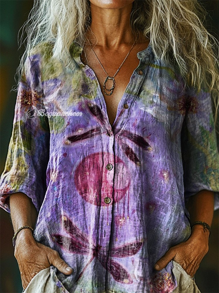Women's Vintage Floral Dragonfly Art Print Casual Cotton Linen Shirt