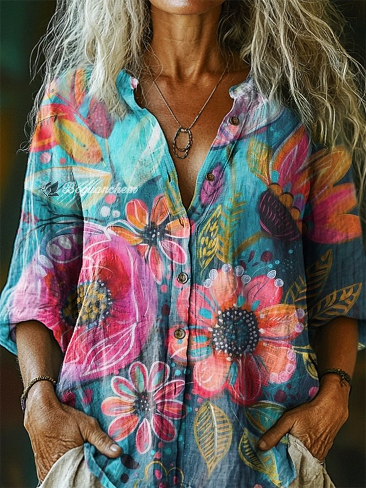 Women's Vintage Floral Pattern Art Print Casual Cotton Linen Shirt