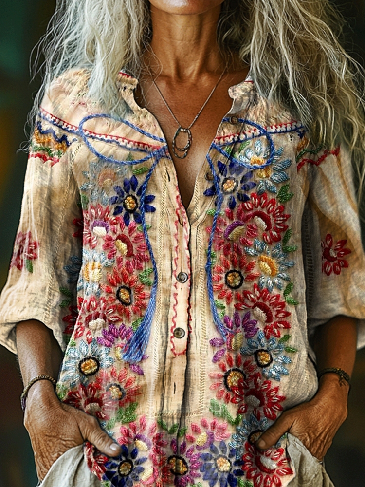 Women's Vintage Floral Pattern Art Print Casual Cotton Linen Shirt