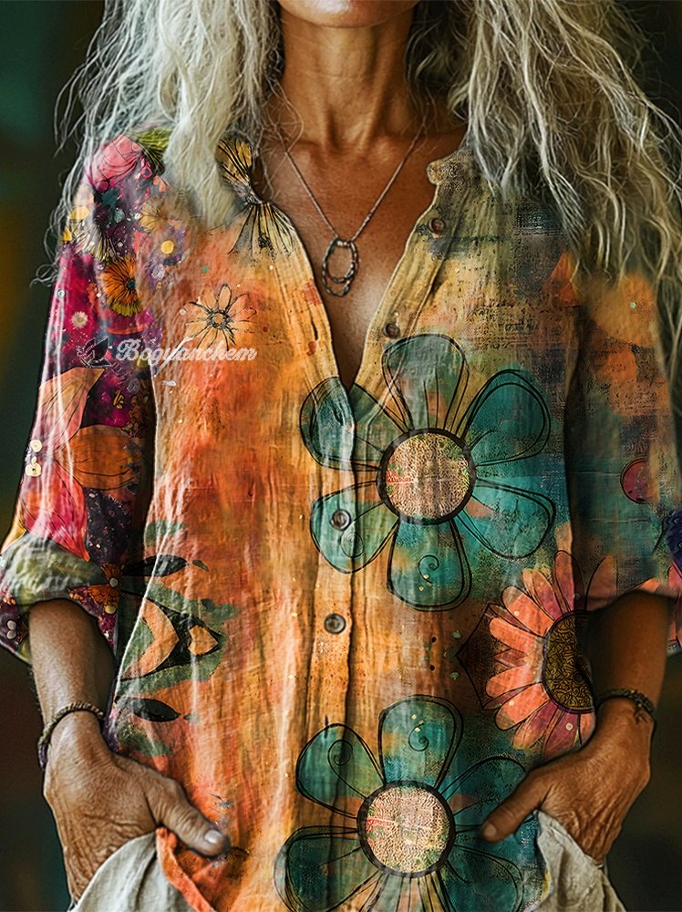Women's Vintage Floral Print Casual Cotton And Linen Shirt