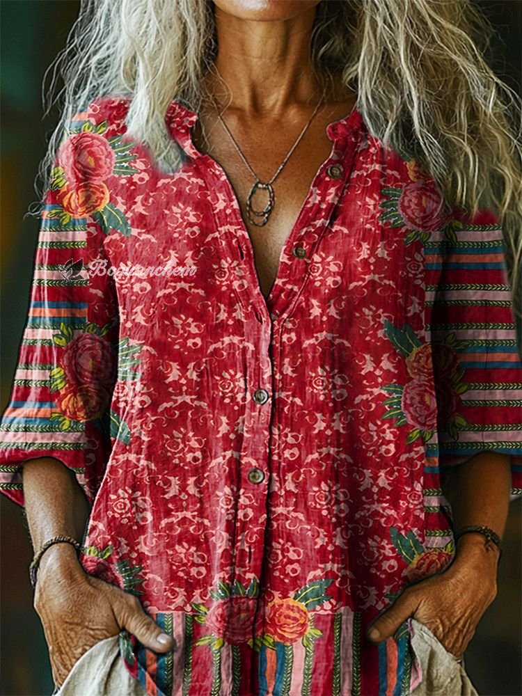 Women's Vintage Floral Tattoo Pattern Art Print Casual Cotton Linen Shirt