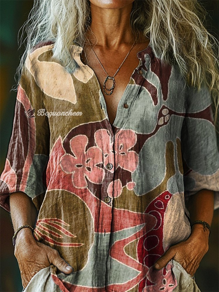 Women's Vintage Floral Tattoo Pattern Art Print Linen Cotton Casual Shirt