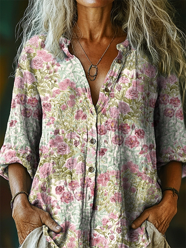 Women's Vintage Floral Tattoo Pattern Art Print Linen Cotton Casual Shirt
